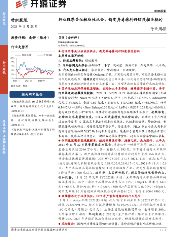 【开源证券】【20211128】纺织服装行业周报:行业旺季关注板块性机会,新变异毒株利好防疫相关标的-9页