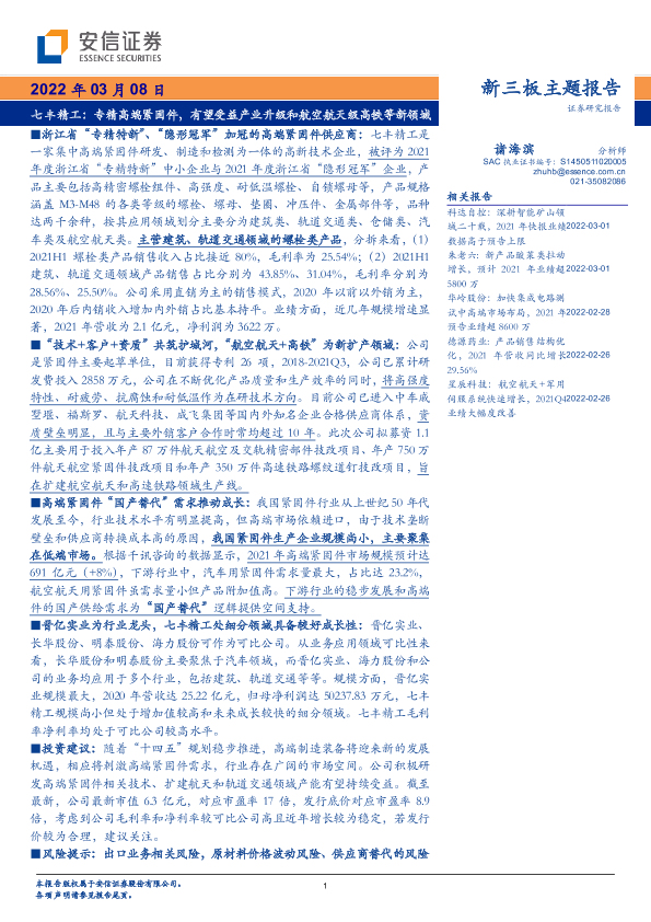 【安信证券】【20220308】新三板主题报告:七丰精工,专精高端紧固件,有望受益产业升级和航空航天级高铁等新领域-33页