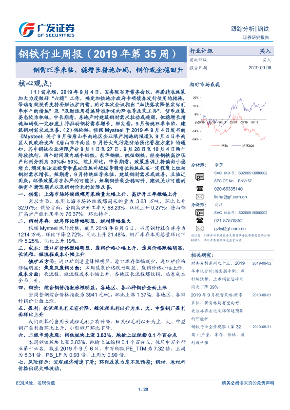 【广发证券】【20190908】2019年第35周钢铁行业周报:钢需旺季来临、稳增长措施加码,钢价或企稳回升-28页