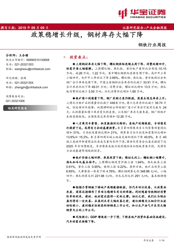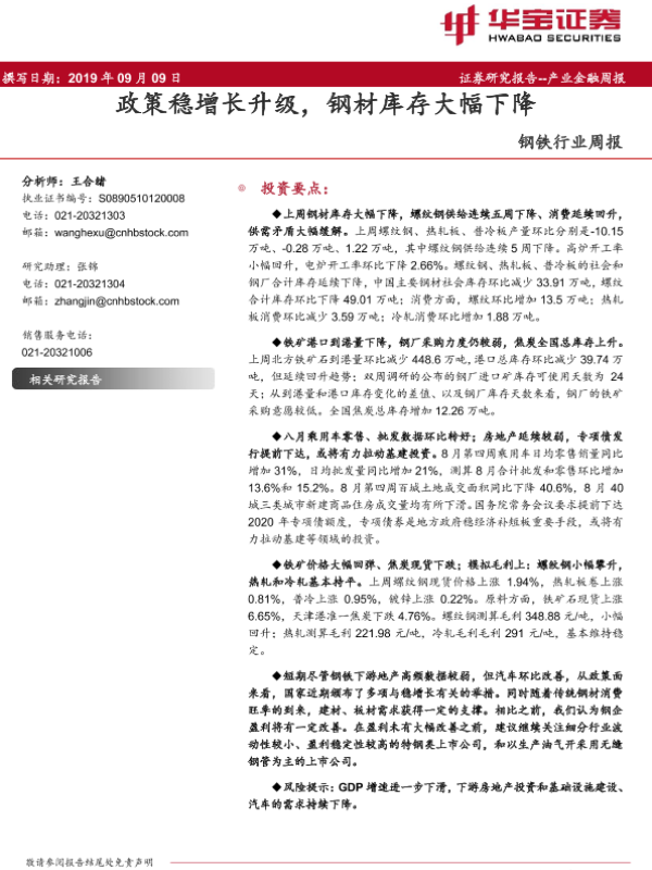 【华宝证券】【20190909】20190909-华宝证券-钢铁行业周报:政策稳增长升级,钢材库存大幅下降-14页