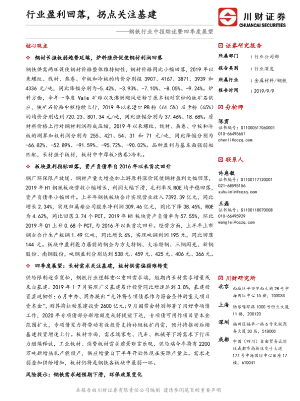 【川财证券】【20190909】钢铁行业中报综述暨四季度展望:行业盈利回落,拐点关注基建-19页