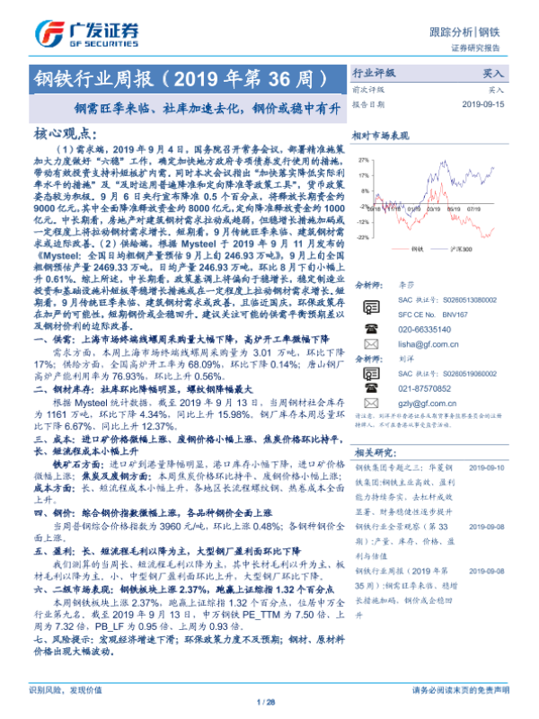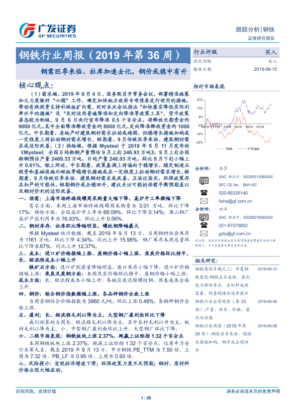 【广发证券】【20190915】20190915-广发证券-钢铁行业周报:钢需旺季来临、社库加速去化,钢价或稳中有升-28页