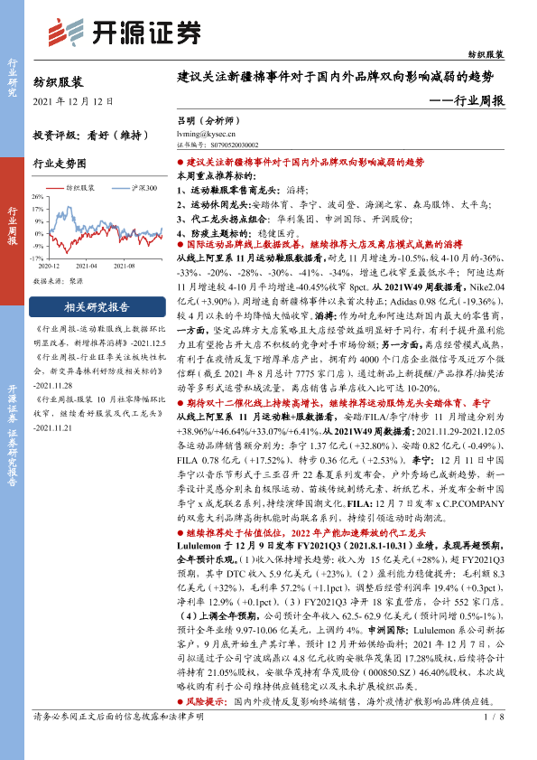 【开源证券】【20211212】纺织服装行业周报:建议关注新疆棉事件对于国内外品牌双向影响减弱的趋势-8页