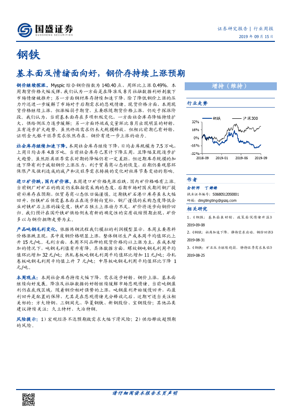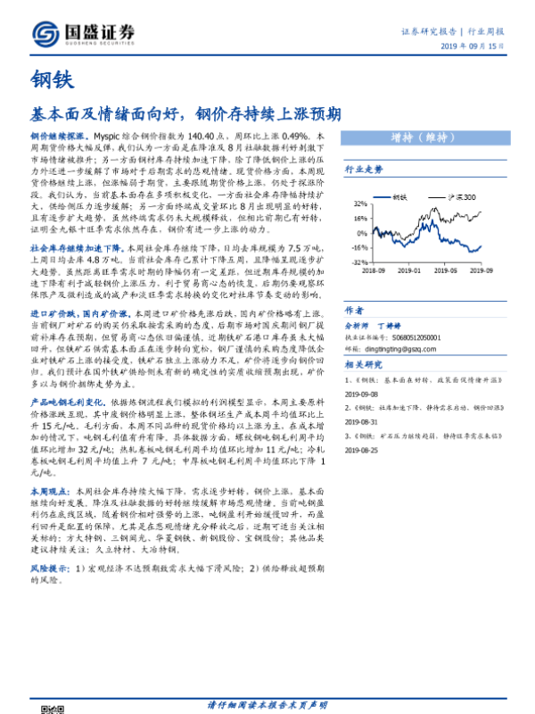 【国盛证券】【20190915】20190915-国盛证券-钢铁行业周报:基本面及情绪面向好,钢价存持续上涨预期-10页