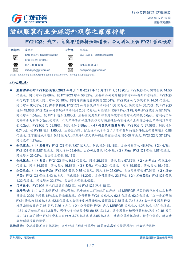 【广发证券】【20211213】纺织服装行业全球海外观察之露露柠檬:FY21Q3:线下、电商渠道保持强劲增长,公司再次上调FY21营收预期-7页