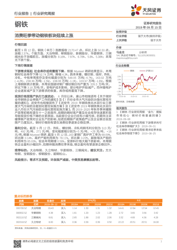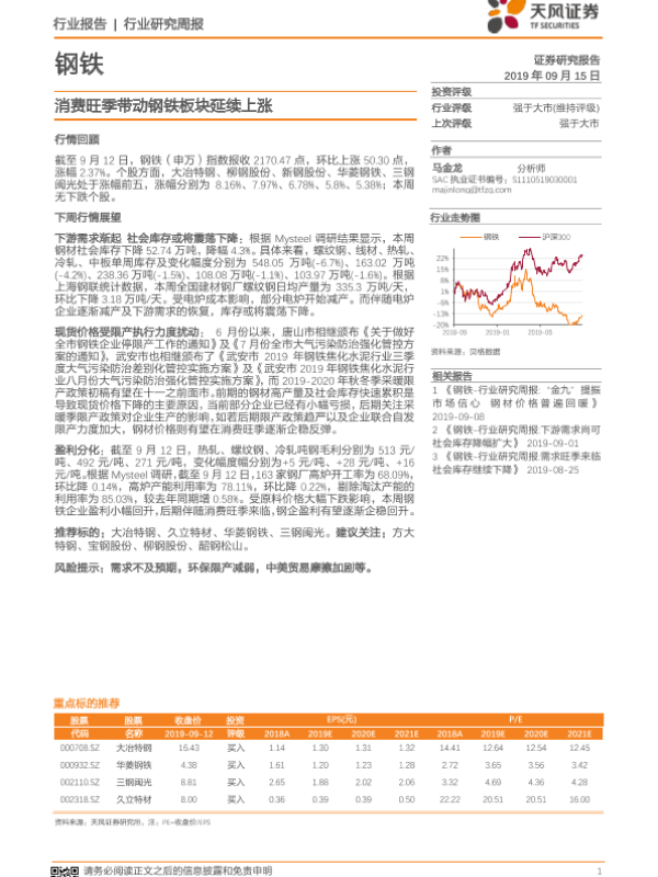 【天风证券】【20190915】20190915-天风证券-钢铁行业研究周报:消费旺季带动钢铁板块延续上涨-11页