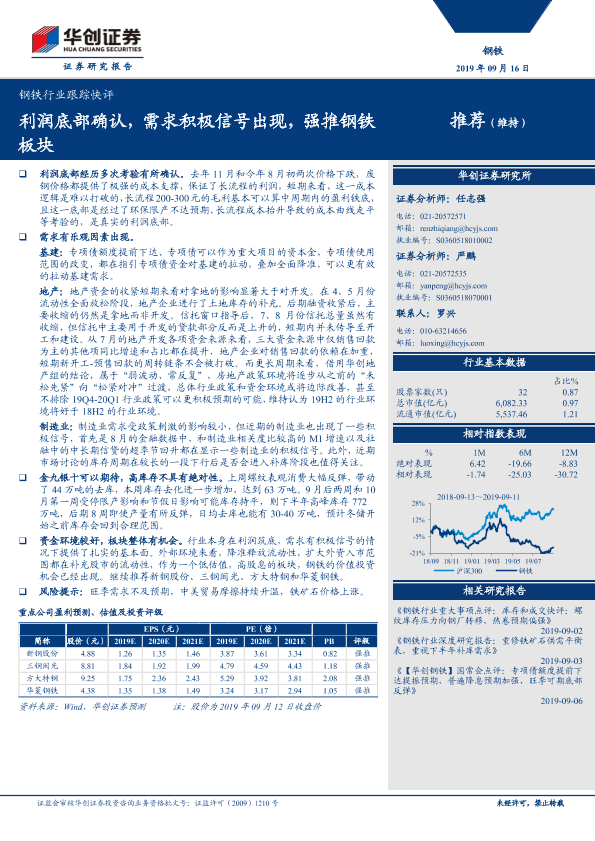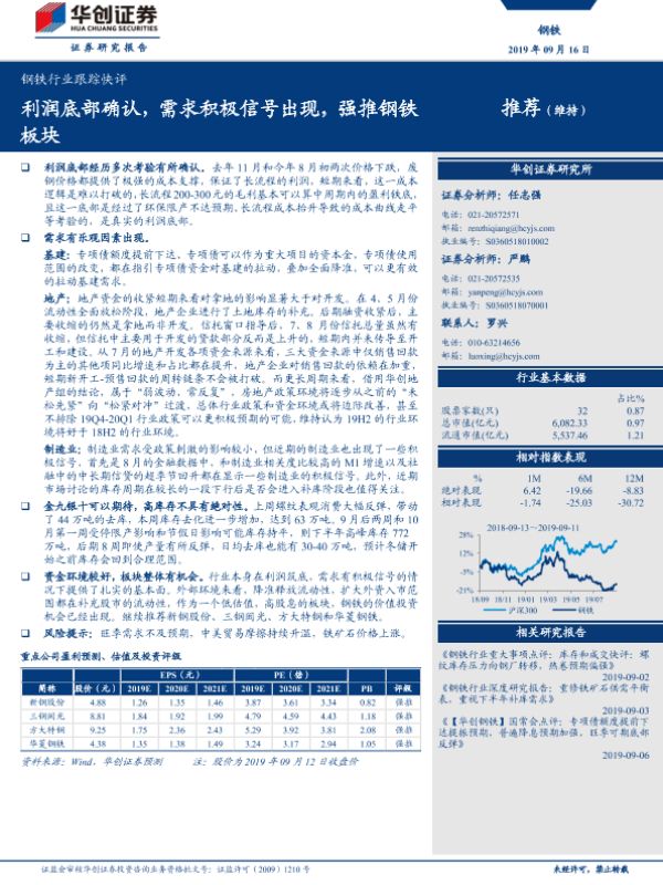 【华创证券】【20190916】钢铁行业跟踪快评:利润底部确认,需求积极信号出现,强推钢铁板块-4页