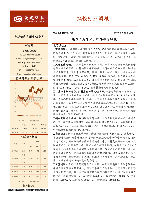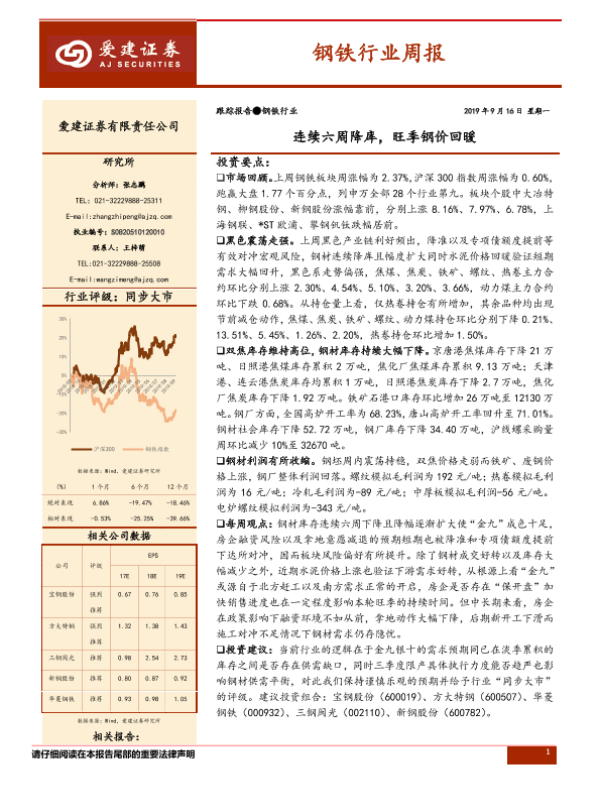 【爱建证券】【20190916】20190916-爱建证券-钢铁行业周报:连续六周降库,旺季钢价回暖-23页