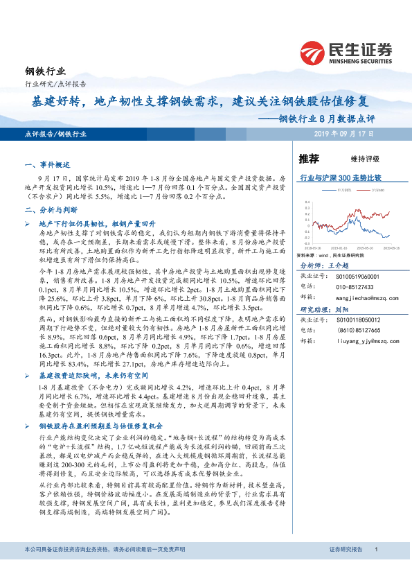 【民生证券】【20190917】20190917-民生证券-钢铁行业8月数据点评:基建好转,地产韧性支撑钢铁需求,建议关注钢铁股估值修复-4页