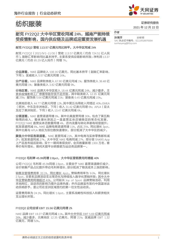 【天风证券】【20211222】纺织服装:耐克FY22Q2大中华区营收同减24%,越南产能持续受疫情影响,国内供应链及品牌或迎重要发展机遇-3页
