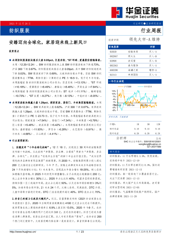 【华金证券】【20211226】20211226-华金证券-纺织服装行业周报:安踏迈向全球化,家居迎来线上新风口-23页