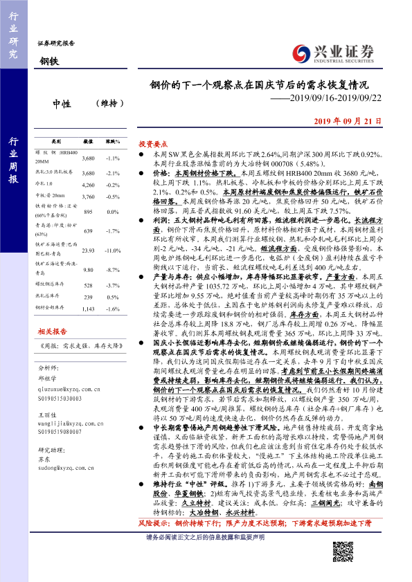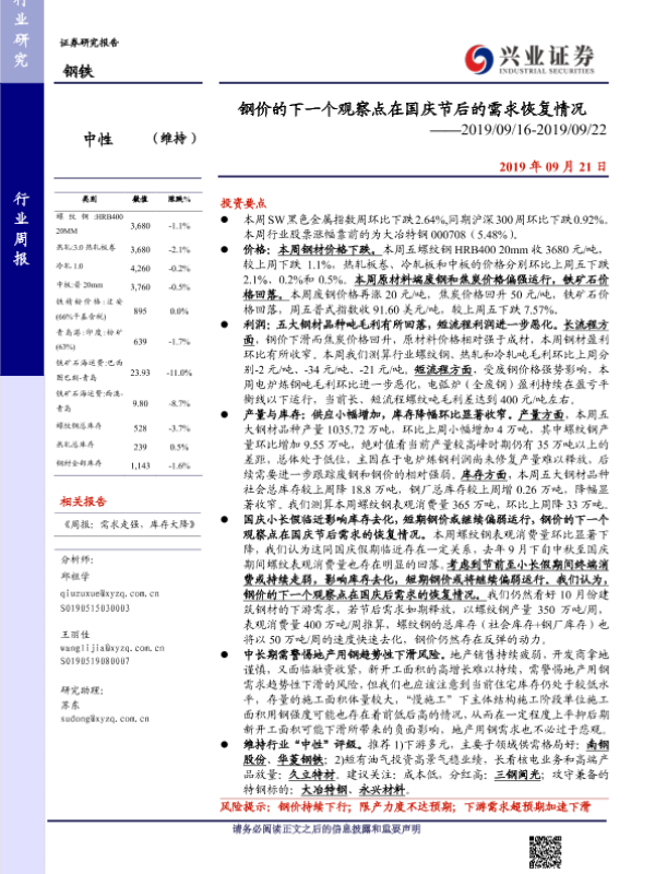 【兴业证券】【20190921】钢价的下一个观察点在国庆节后的需求恢复情况-15页
