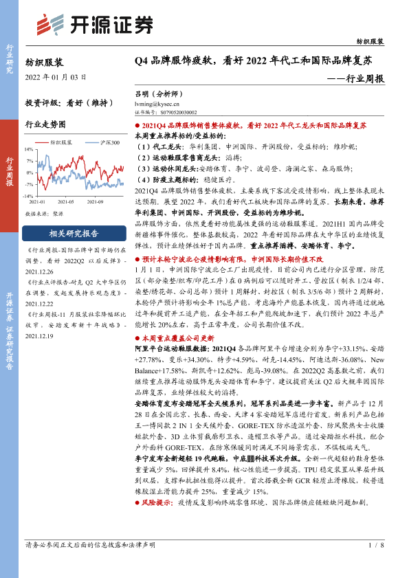 【开源证券】【20220103】20220103-开源证券-纺织服装行业周报:Q4品牌服饰疲软,看好2022年代工和国际品牌复苏-8页