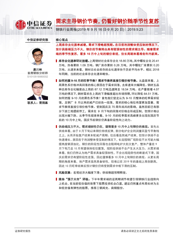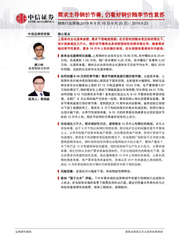 【中信证券】【20190923】20190923-中信证券-钢铁行业周报:需求主导钢价节奏,仍看好钢价随季节性复苏-13页