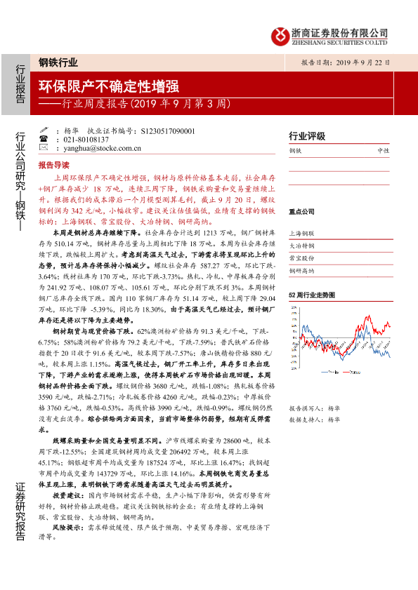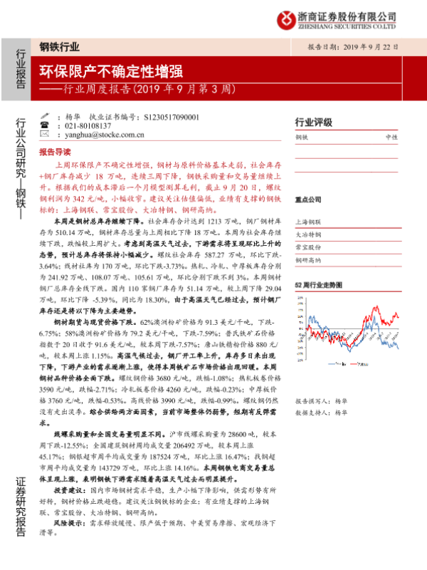 【浙商证券】【20190922】20190922-浙商证券-钢铁行业周度报告(2019年9月第3周):环保限产不确定性增强-17页