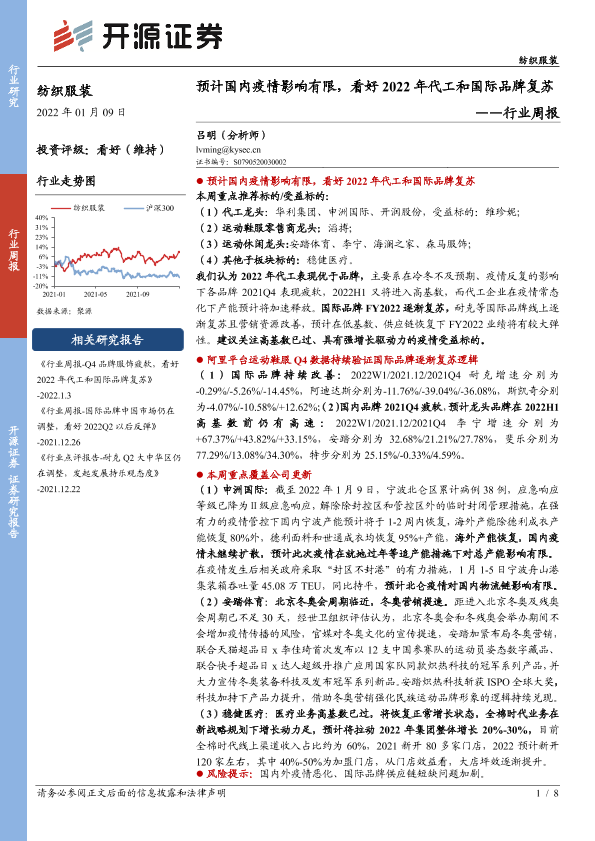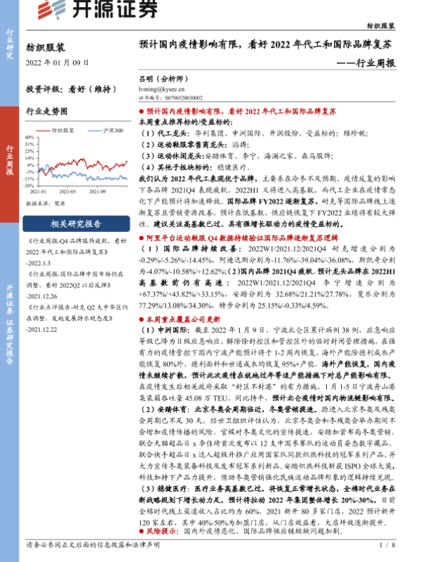 【开源证券】【20220109】纺织服装行业周报:预计国内疫情影响有限,看好2022年代工和国际品牌复苏-8页