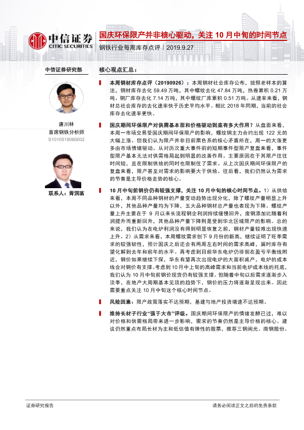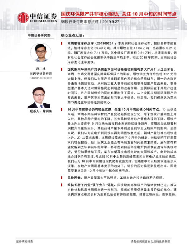 【中信证券】【20190927】钢铁行业每周库存点评:国庆环保限产并非核心驱动,关注10月中旬的时间节点-3页