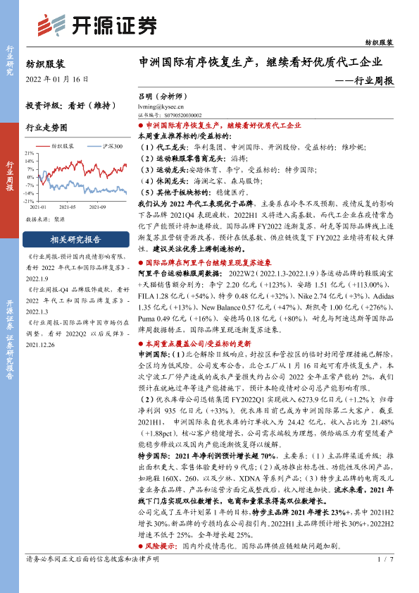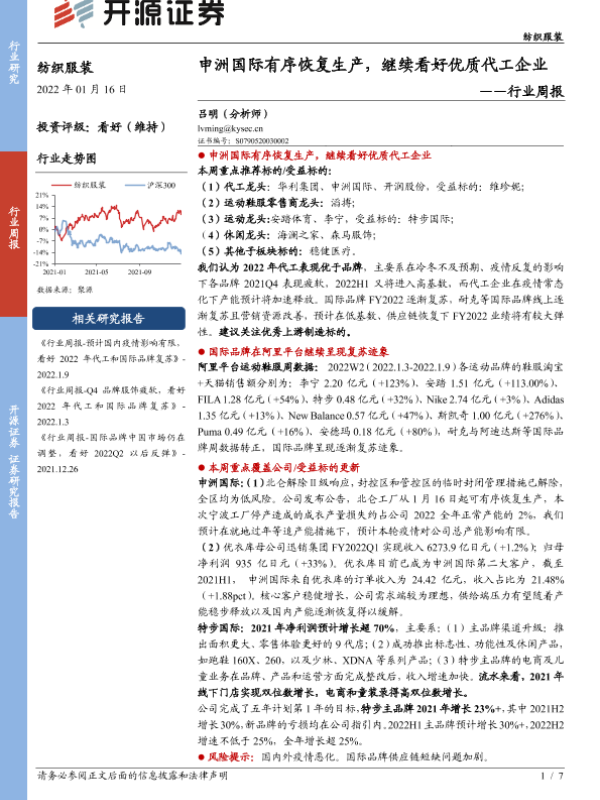 【开源证券】【20220116】20220116-开源证券-纺织服装行业周报:申洲国际有序恢复生产,继续看好优质代工企业-7页