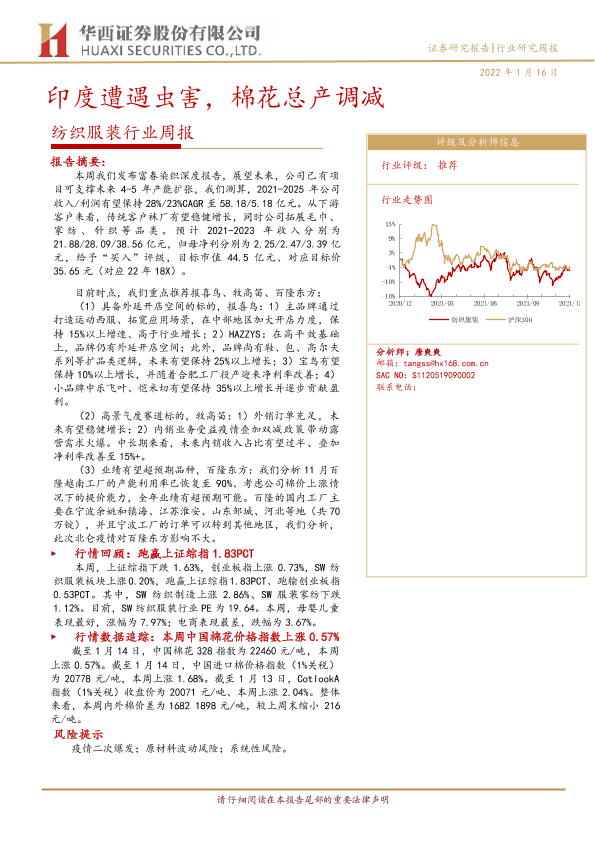 【华西证券】【20220116】20220116-华西证券-纺织服装行业周报:印度遭遇虫害,棉花总产调减-15页