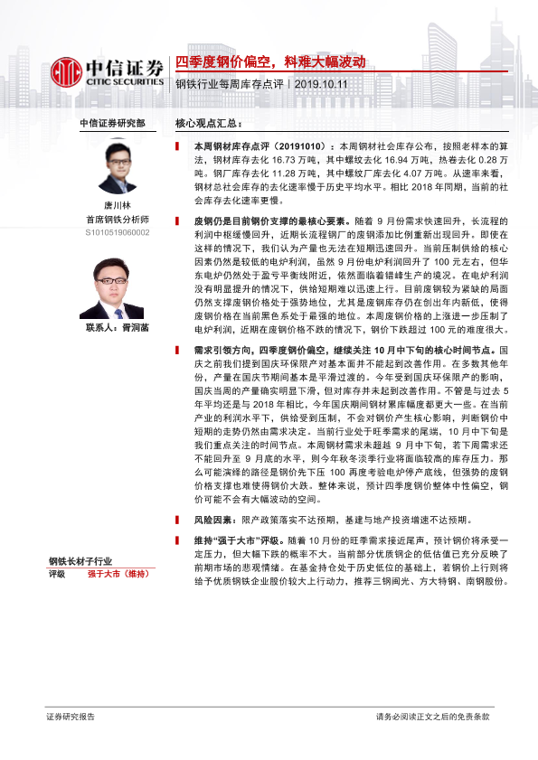 【中信证券】【20191011】钢铁行业每周库存点评:四季度钢价偏空,料难大幅波动-3页