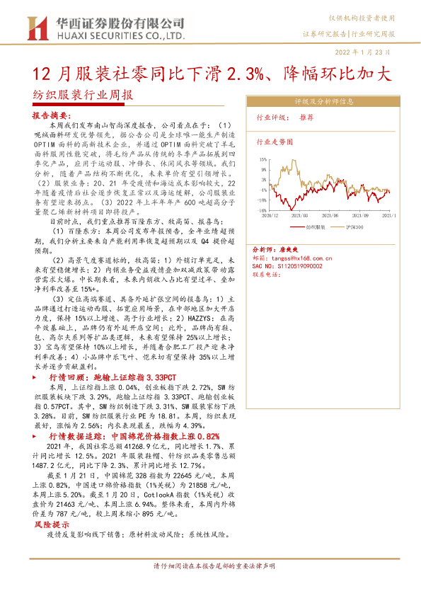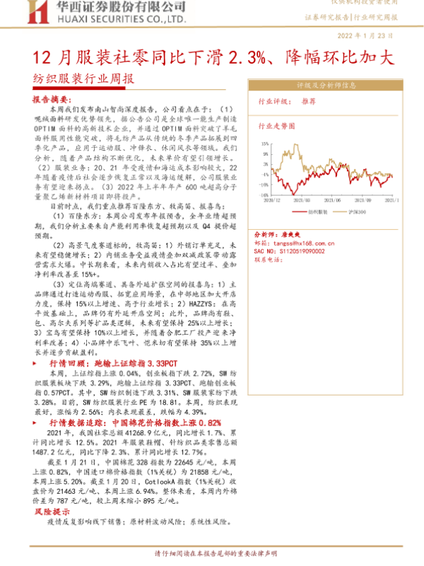 【华西证券】【20220123】20220123-华西证券-纺织服装行业周报:12月服装社零同比下滑2.3%、降幅环比加大-18页