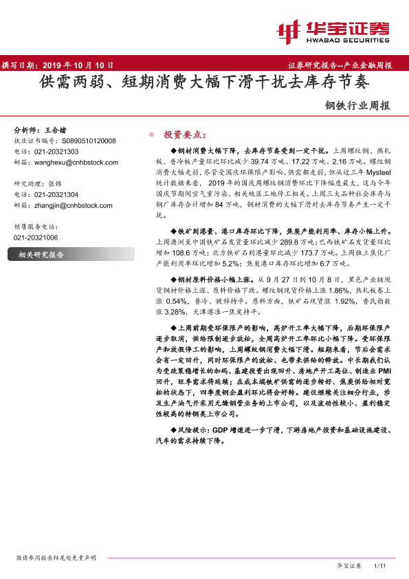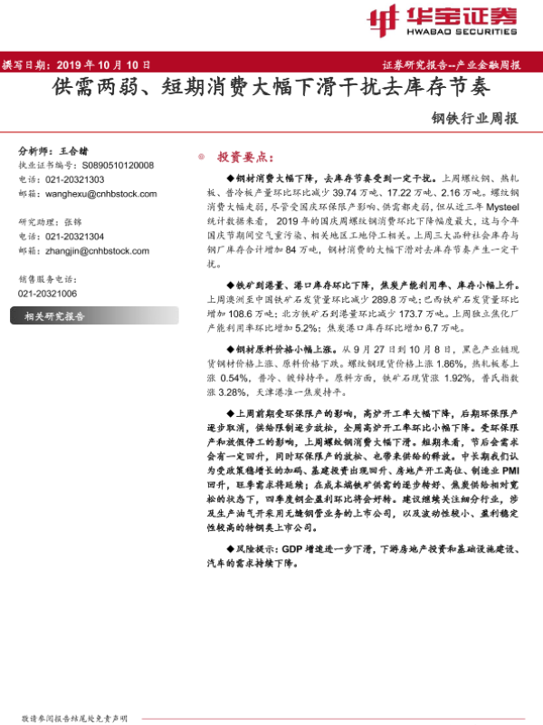【华宝证券】【20191010】20191010-华宝证券-钢铁行业周报:供需两弱、短期消费大幅下滑干扰去库存节奏-11页