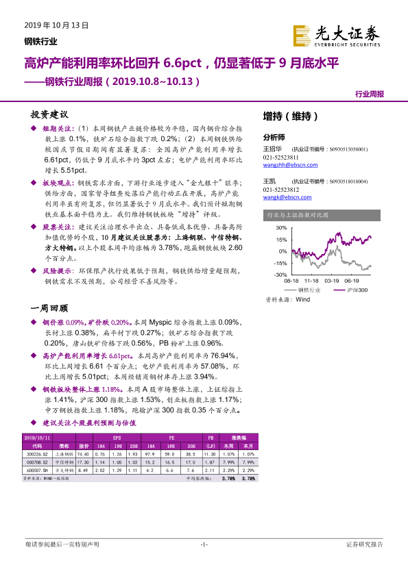 【光大证券】【20191013】20191013-光大证券-钢铁行业周报:高炉产能利用率环比回升6.6pct,仍显著低于9月底水平-8页