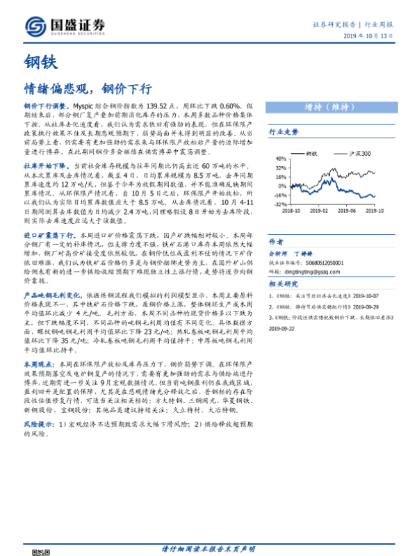 【国盛证券】【20191013】20191013-国盛证券-钢铁行业周报:情绪偏悲观,钢价下行-10页