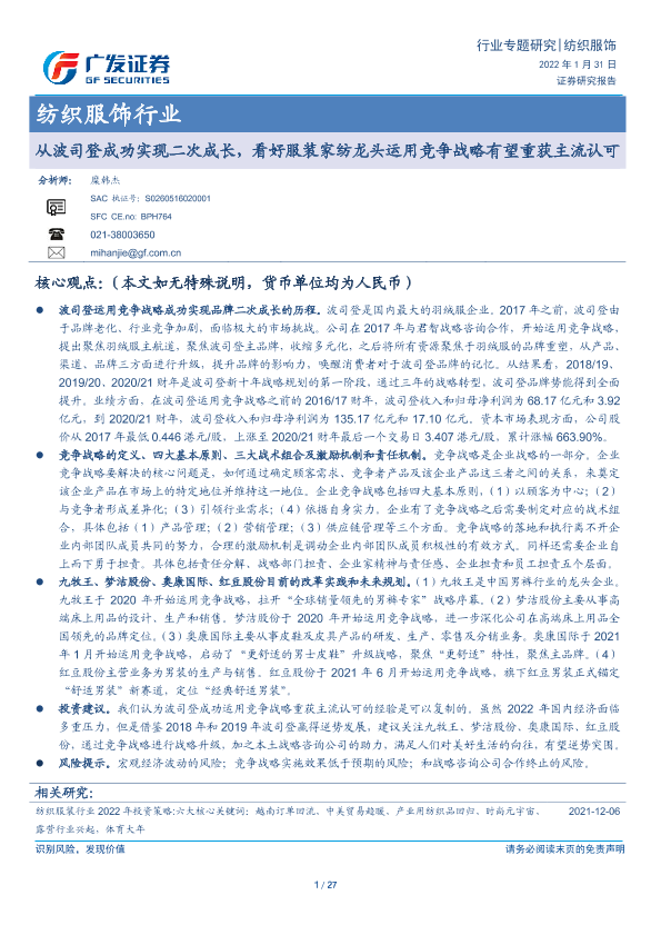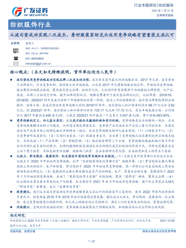 【广发证券】【20220131】20220131-广发证券-纺织服饰行业专题研究:从波司登成功实现二次成长,看好服装家纺龙头运用竞争战略有望重获主流认可-27页