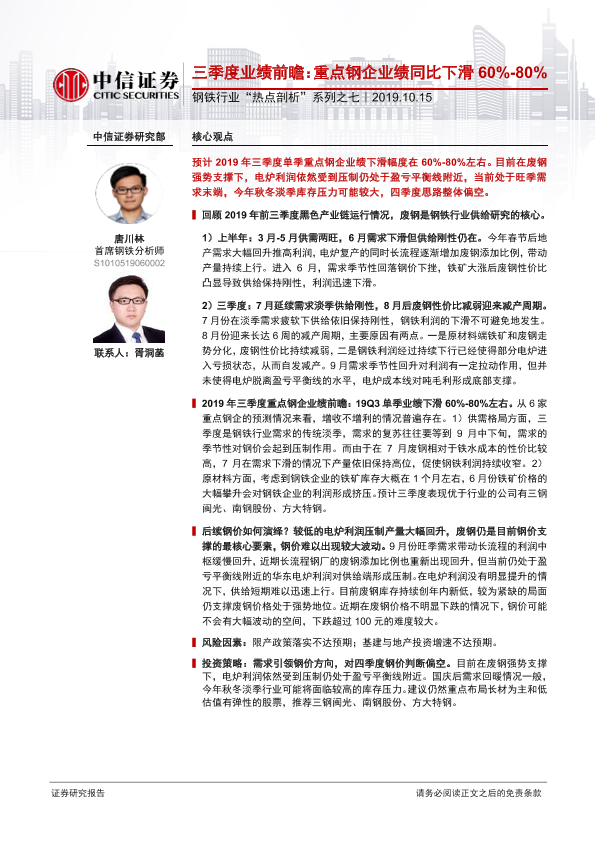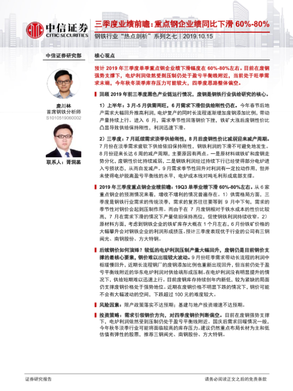 【中信证券】【20191015】钢铁行业“热点剖析”系列之七:三季度业绩前瞻:重点钢企业绩同比下滑60%-80%-13页