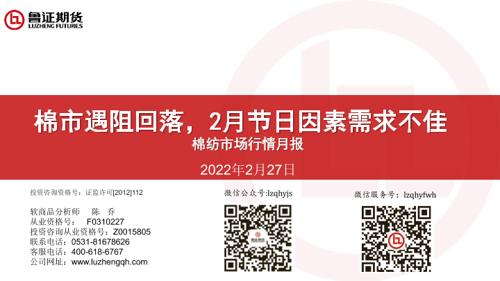 【鲁证期货】【20220227】棉纺市场行情月报:棉市遇阻回落,2月节日因素需求不佳-20页