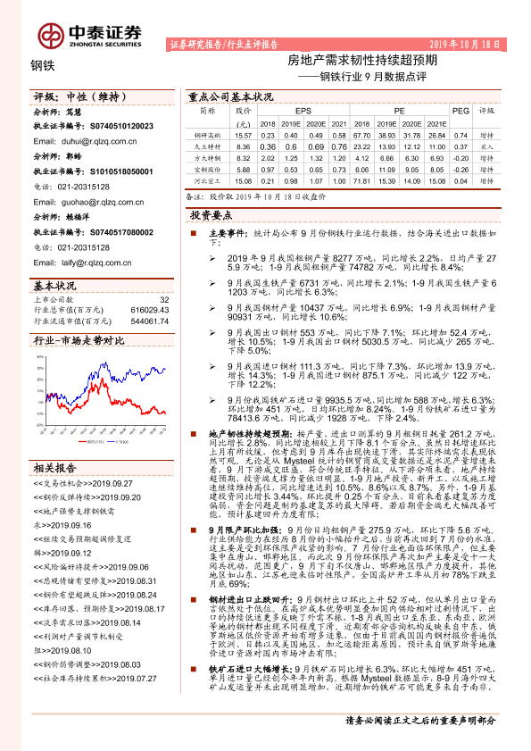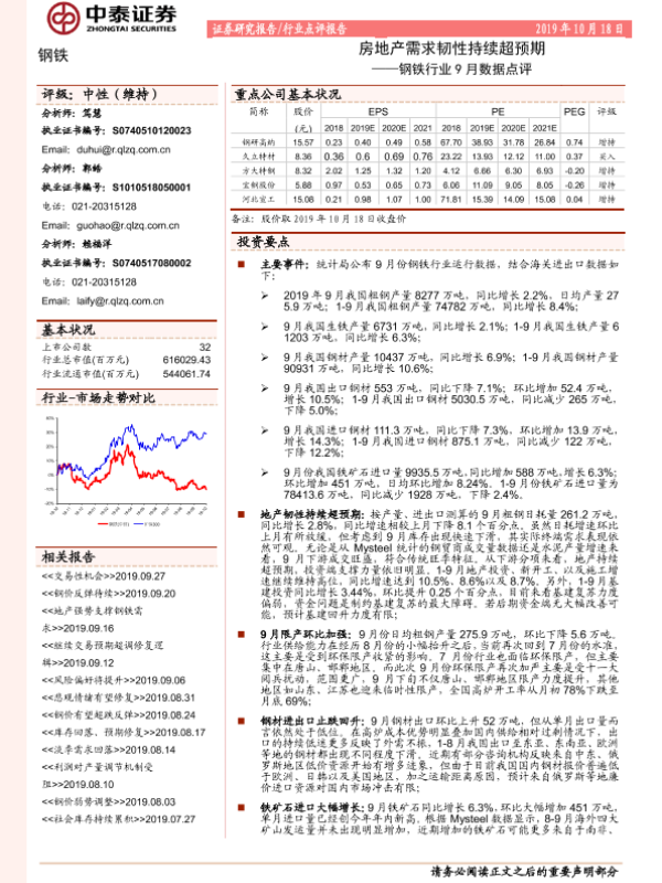 【中泰证券】【20191018】钢铁行业9月数据点评:房地产需求韧性持续超预期-5页