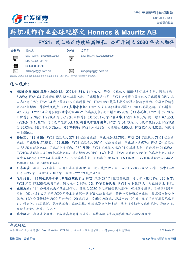【广发证券】【20220208】纺织服饰行业全球观察之 Hennes&Mauritz AB:FY21:线上渠道持续较高增长,公司计划至2030年收入翻倍-7页