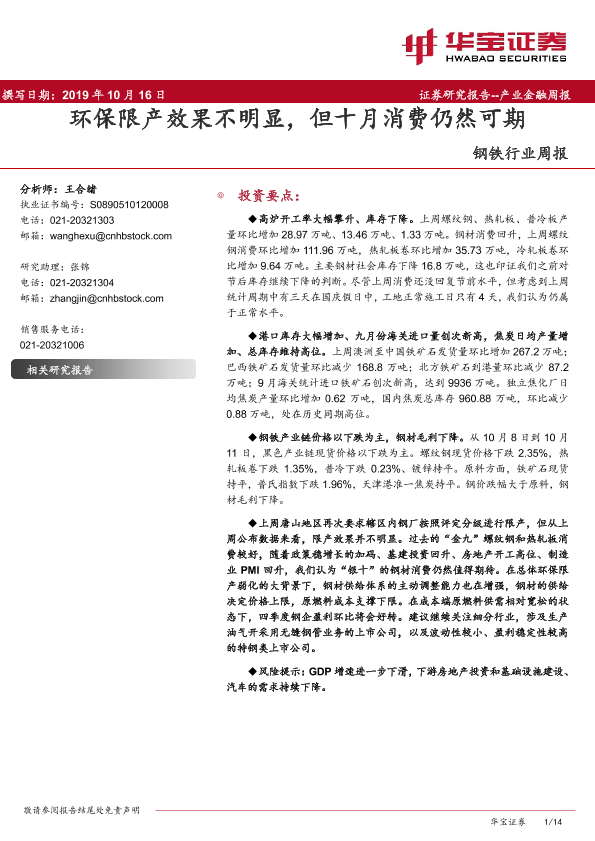 【华宝证券】【20191016】20191016-华宝证券-钢铁行业周报:环保限产效果不明显,但十月消费仍然可期-14页
