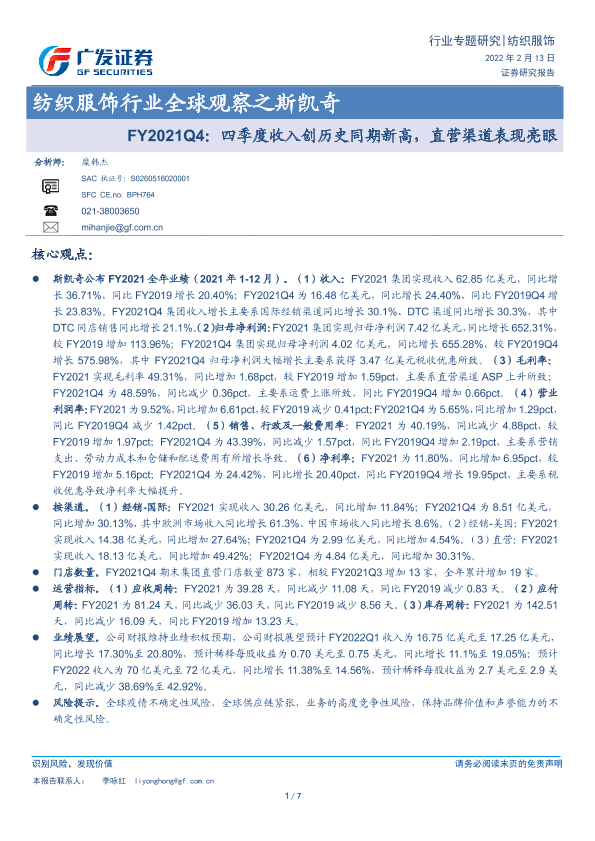【广发证券】【20220213】纺织服饰行业全球观察之斯凯奇:FY2021Q4:四季度收入创历史同期新高,直营渠道表现亮眼-7页
