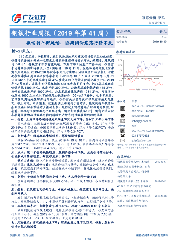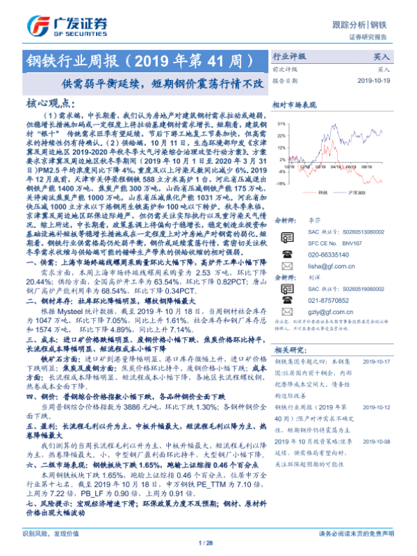 【广发证券】【20191019】20191019-广发证券-钢铁行业周报(2019年第41周):供需弱平衡延续,短期钢价震荡行情不改-28页