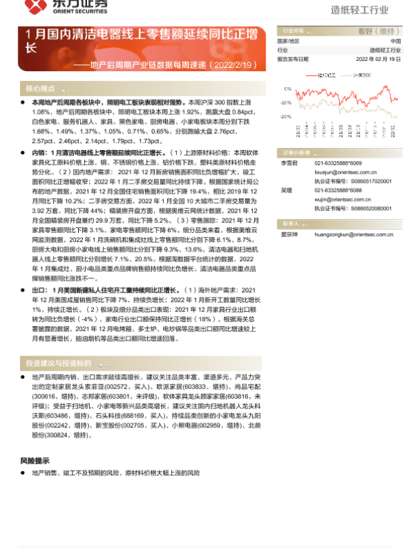 【东方证券】【20220219】20220219-东方证券-造纸轻工行业:地产后周期产业链数据每周速递:1月国内清洁电器线上零售额延续同比正增长-14页