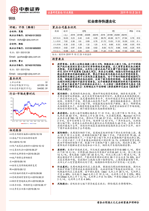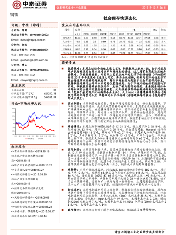 【中泰证券】【20191026】20191026-中泰证券-钢铁行业周报:社会库存快速去化-14页