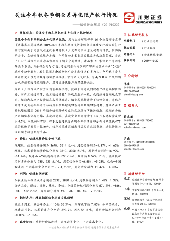 【川财证券】【20191020】20191020-川财证券-钢铁行业周报:关注今年秋冬季钢企差异化限产执行情况-23页