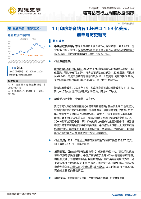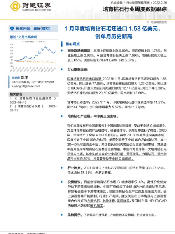【财通证券】【20220220】20220220-财通证券-培育钻石行业周度数据跟踪:1月印度培育钻石毛坯进口1.53亿美元,创单月历史新高-10页