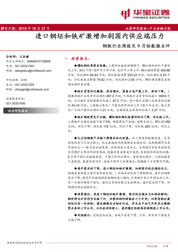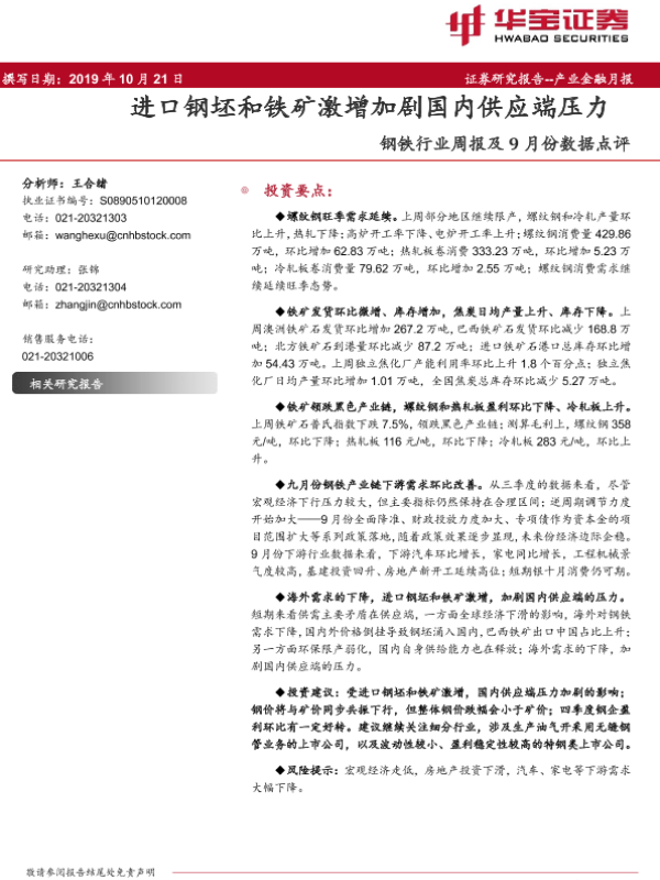 【华宝证券】【20191021】20191021-华宝证券-钢铁行业周报及9月份数据点评:进口钢坯和铁矿激增加剧国内供应端压力-19页