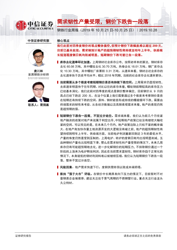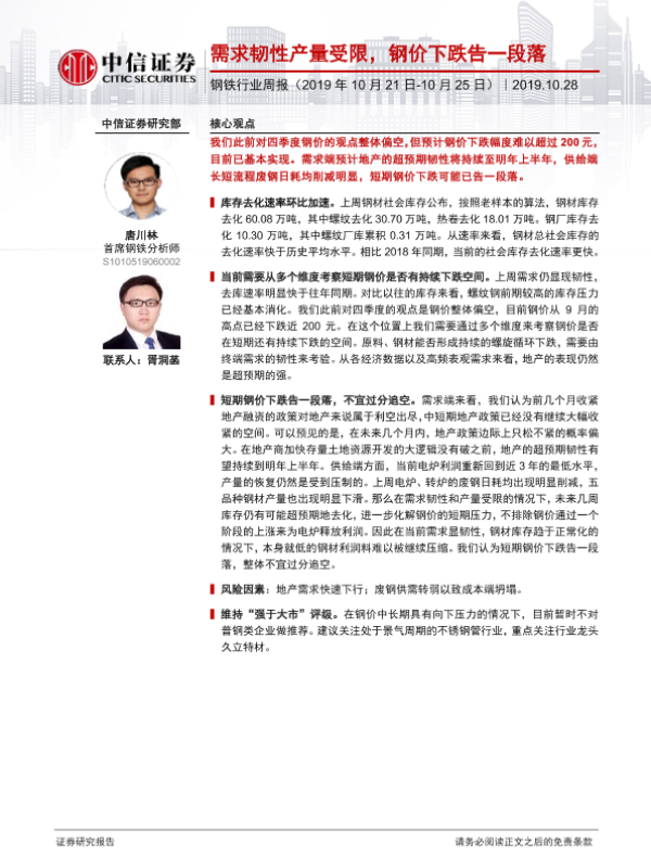 【中信证券】【20191028】20191028-中信证券-钢铁行业周报:需求韧性产量受限,钢价下跌告一段落-13页