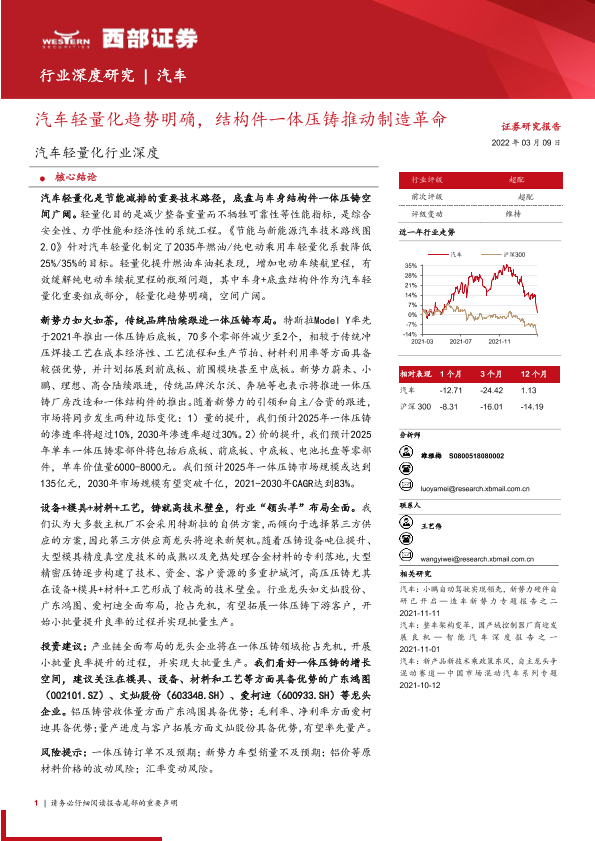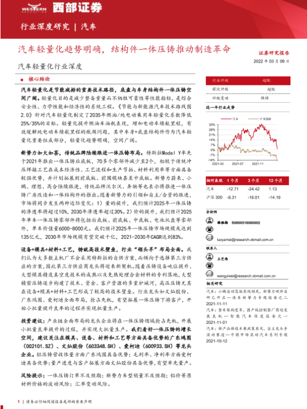 【西部证券】【20220309】汽车轻量化行业深度:汽车轻量化趋势明确,结构件一体压铸推动制造革命-28页