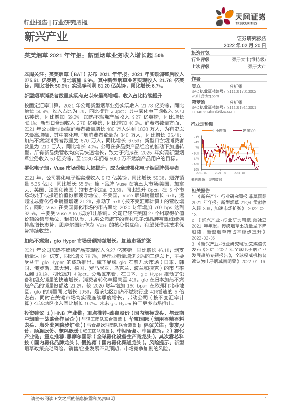 【天风证券】【20220220】20220220-天风证券-新兴产业行业研究周报:英美烟草2021年年报:新型烟草业务收入增长超50%-4页