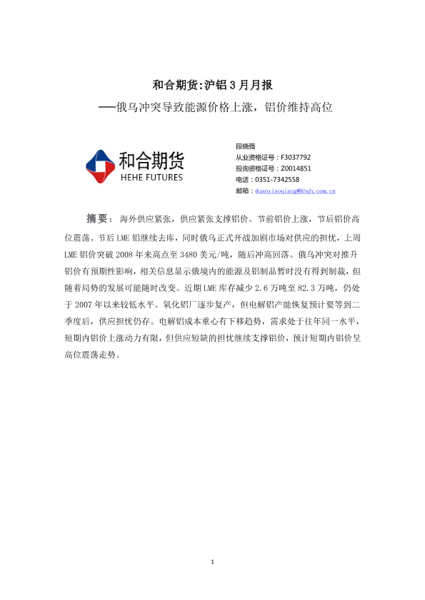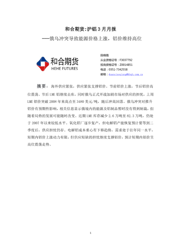 【和合期货】【20220304】沪铝3月月报:俄乌冲突导致能源价格上涨,铝价维持高位-15页