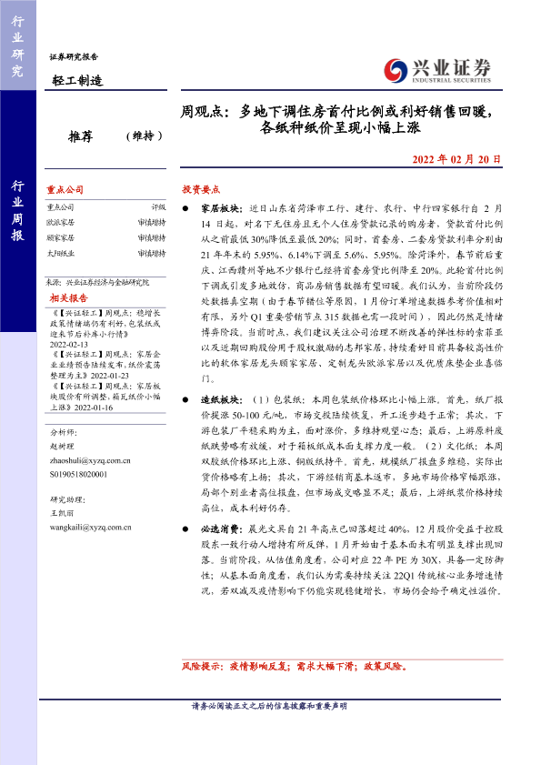 【兴业证券】【20220220】周观点:多地下调住房首付比例或利好销售回暖,各纸种纸价呈现小幅上涨-22页