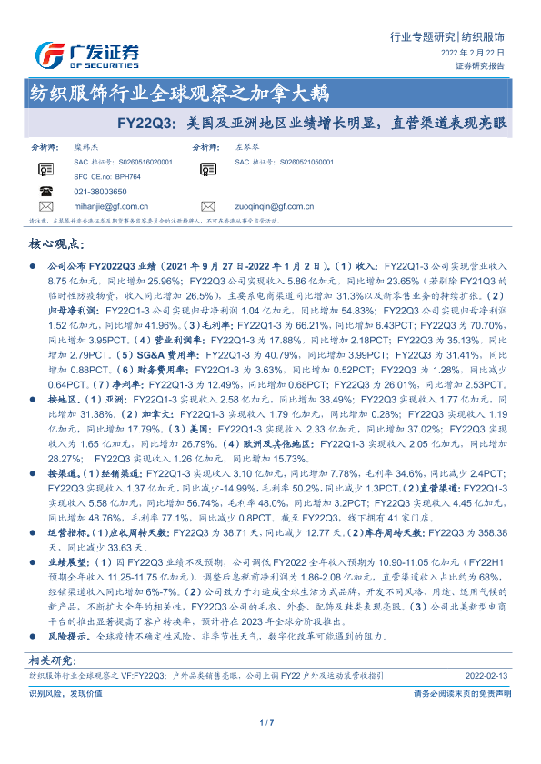 【广发证券】【20220222】纺织服饰行业全球观察之加拿大鹅:FY22Q3:美国及亚洲地区业绩增长明显,直营渠道表现亮眼-7页