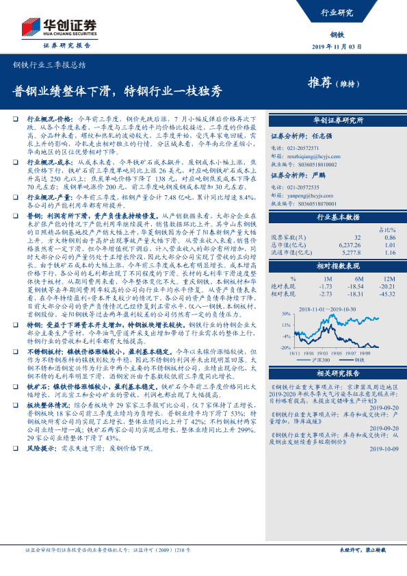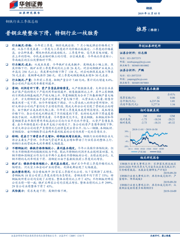 【华创证券】【20191103】20191103-华创证券-钢铁行业三季报总结:普钢业绩整体下滑,特钢行业一枝独秀-17页