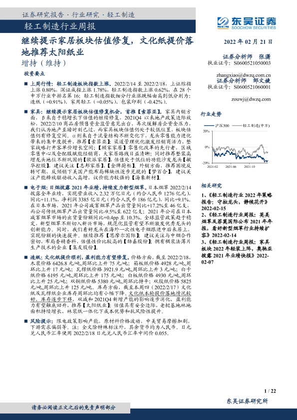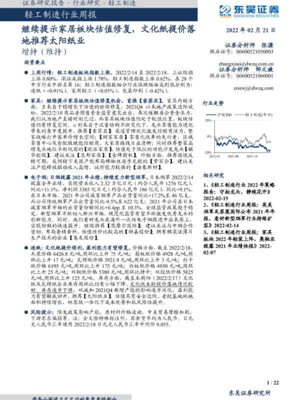 【东吴证券】【20220221】20220221-东吴证券-轻工制造行业周报:继续提示家居板块估值修复,文化纸提价落地推荐太阳纸业-22页