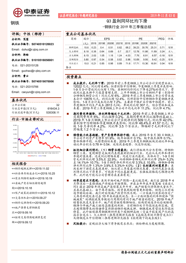 【中泰证券】【20191103】钢铁行业2019年三季报总结:Q3盈利同环比均下滑-10页